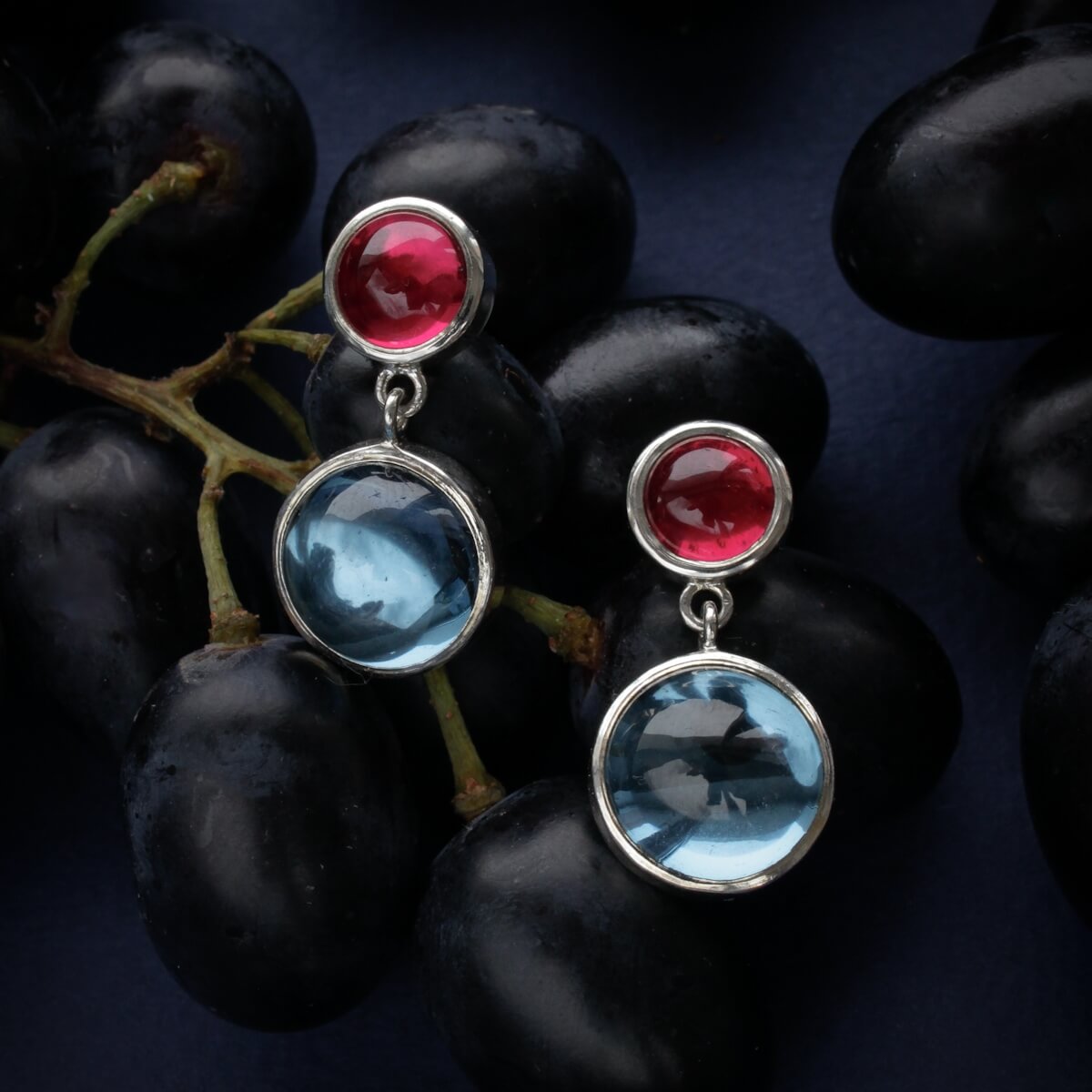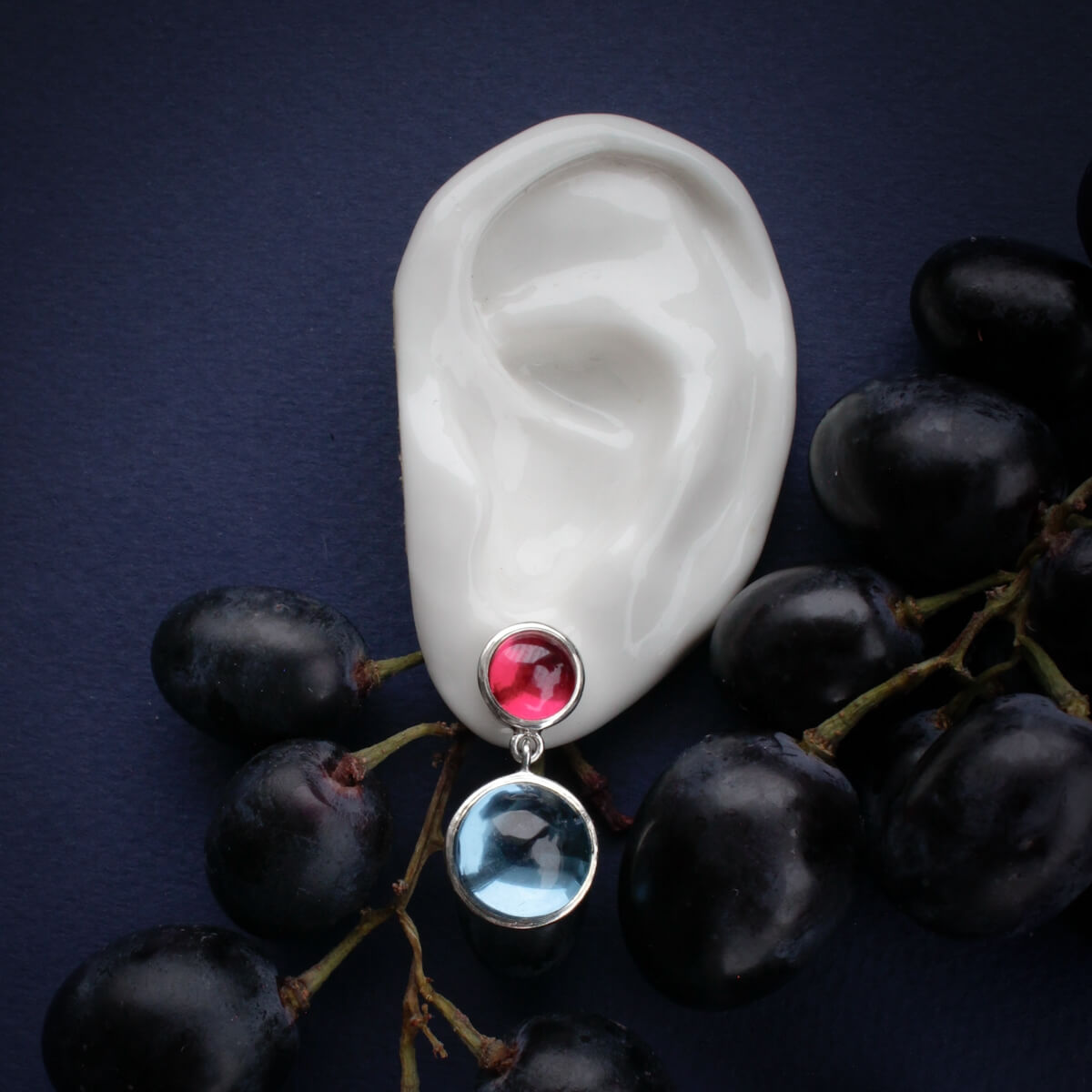 Need unikaalsed hõbekõrvarõngad on käsitsi valmistatud ning ühendavad endas klassikalise vormi ja värvika, kuid tasakaaluka disaini. Kaheosaline lahendus toob kokku rubiinpunase ülemise ja helesinise alumise kiviga, luues elegantse värvikontrasti, mis püüab pilku, kuid jääb maitsekaks.