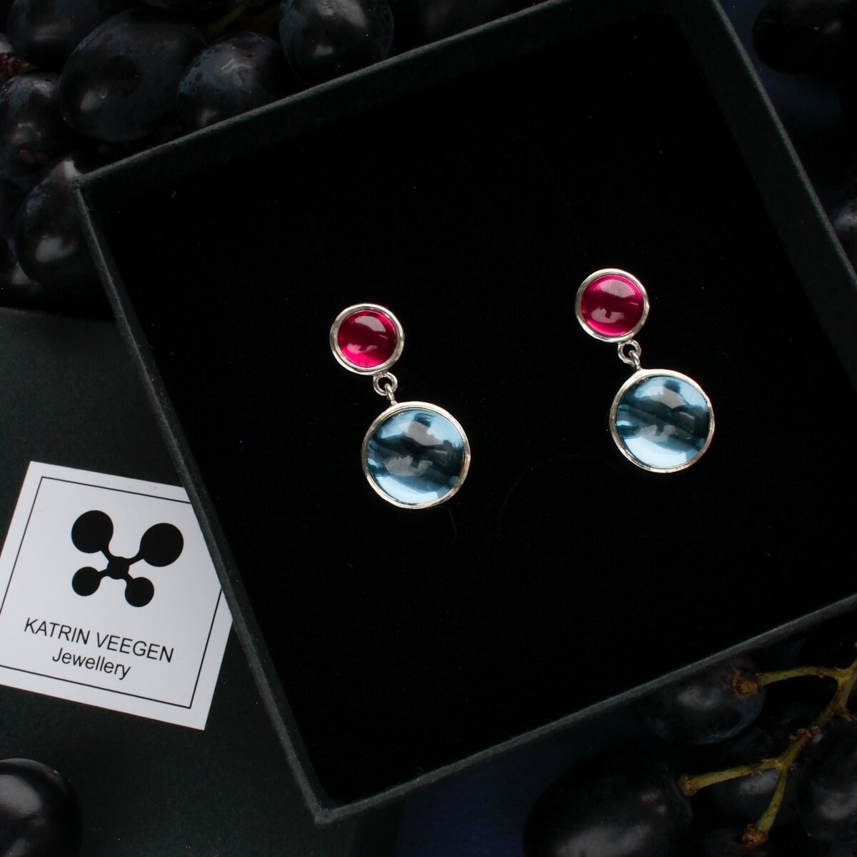 Hõbedast kõrvarõngad rubiinpunase ja helesinise kiviga.