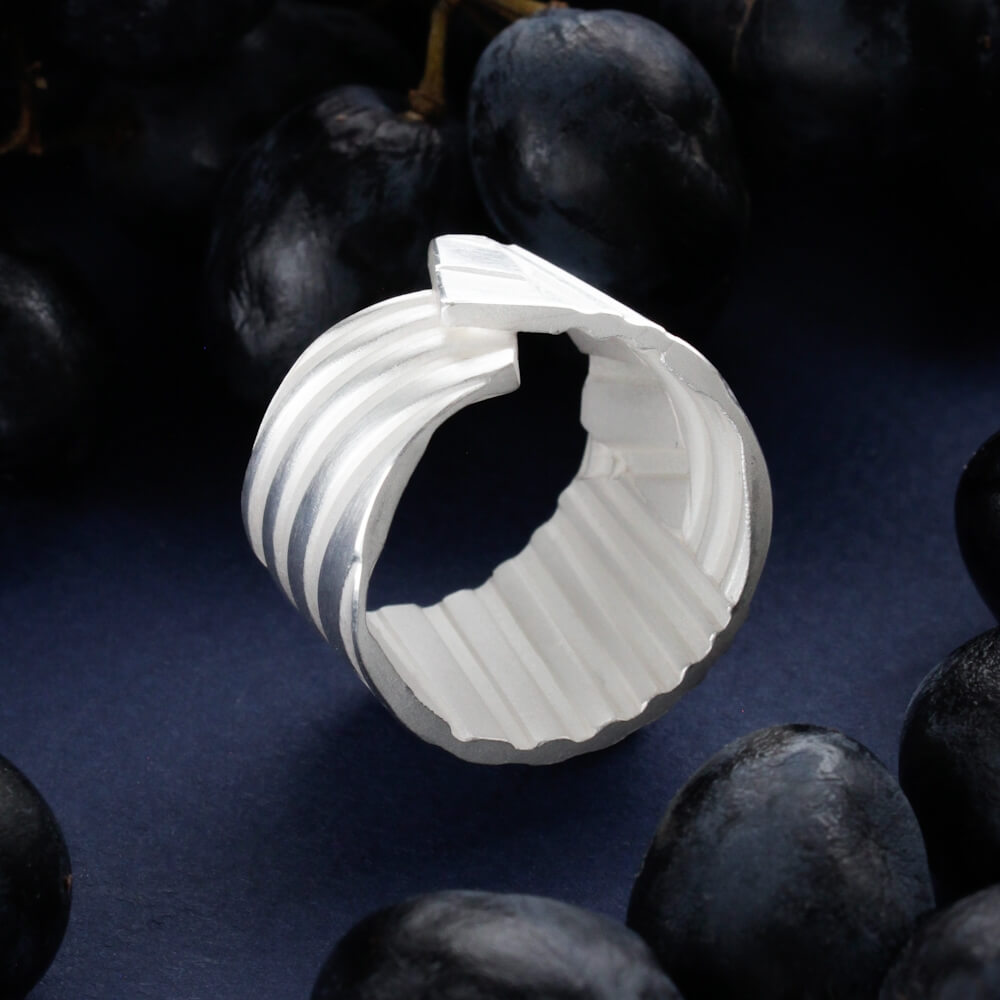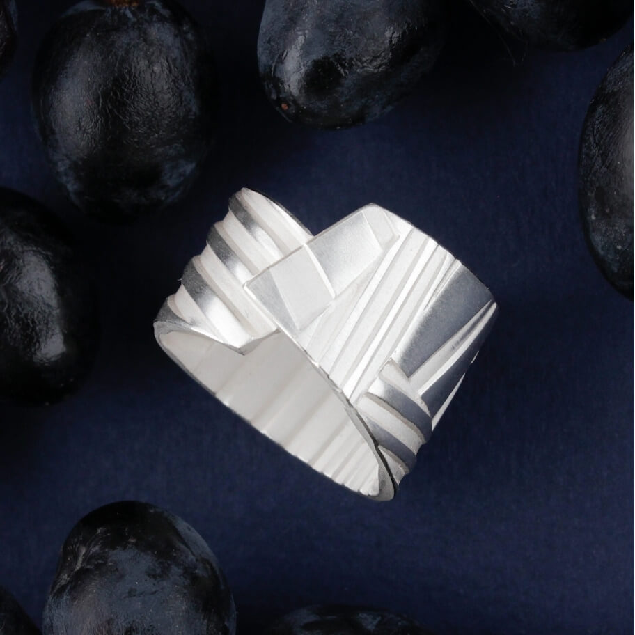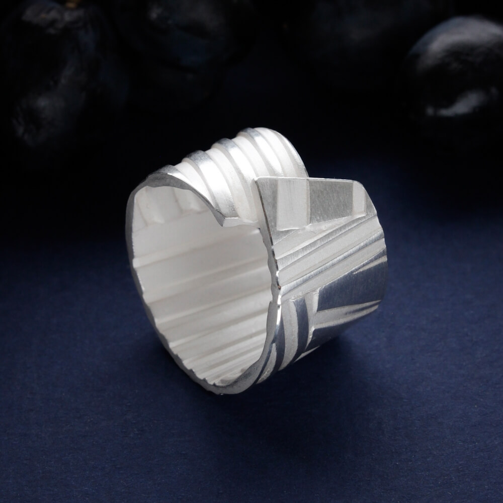 See unikaalne hõbesõrmus on käsitsi valmistatud ehe, mis ühendab endas modernse geomeetria, jõulise vormi ja peene käsitöö. Lai hõbesõrmus paistab silma erineva laiuse ja sügavusega triibulise tekstuuriga, mis loob põneva valguse ja varju mängu. Mattide ja läikivate pindade vaheldumine annab sõrmusele skulpturaalse ja ajatu ilme.