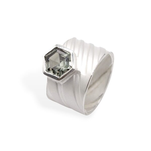 Lai triipudega hõbedast sõrmus, mida kroonib suur ning omapärane kuusnurkne kivi.