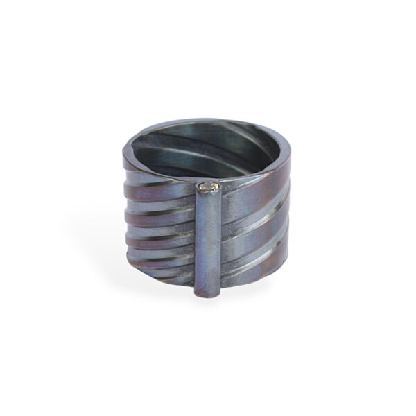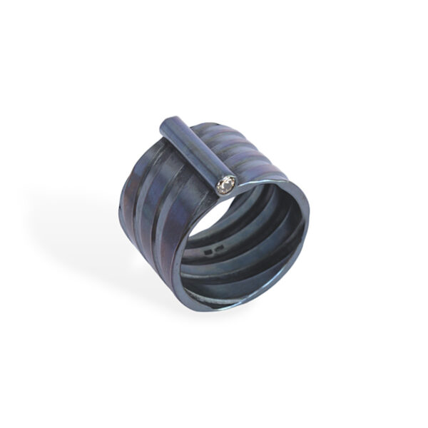 Lai sinakas-lillaka varjundiga tumedaks oksüdeeritud hõbedast sõrmus, kahepoolse kiviistutusega.