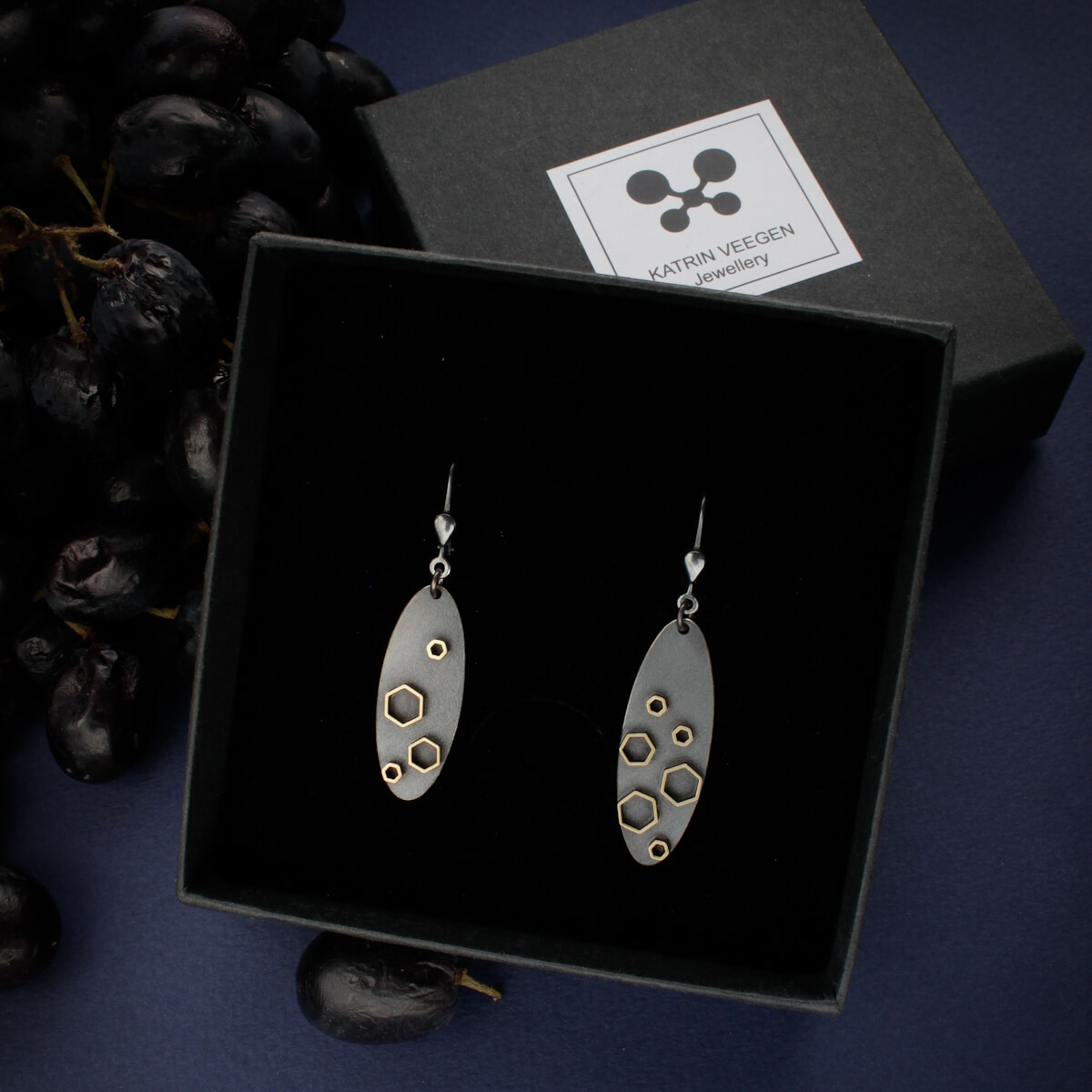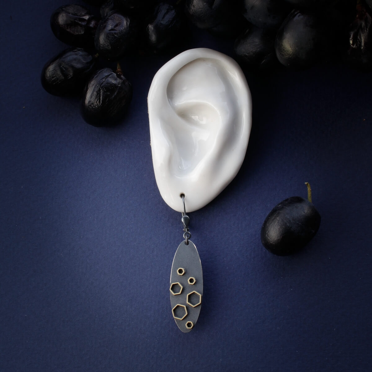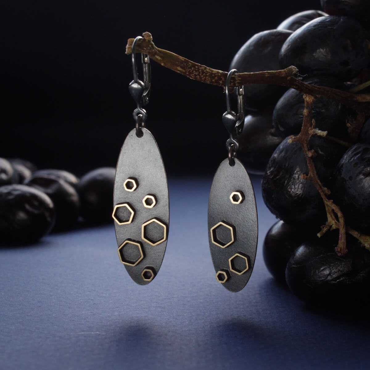 Need käsitsi valmistatud 925 hõbedast kõrvarõngad on inspireeritud geomeetriast ja rahulikust modernsest vormikeelest. Pikliku ovaalse kujuga tumendatud hõbedaplaat on kaunistatud kuusnurksete detailidega, mis loovad peene kontrasti mati pinna ja soojema metallitooni vahel. Muster meenutab mikroskoopilist struktuuri või tähistaevast, andes ehetele isikupärase ja äratuntava ilme.