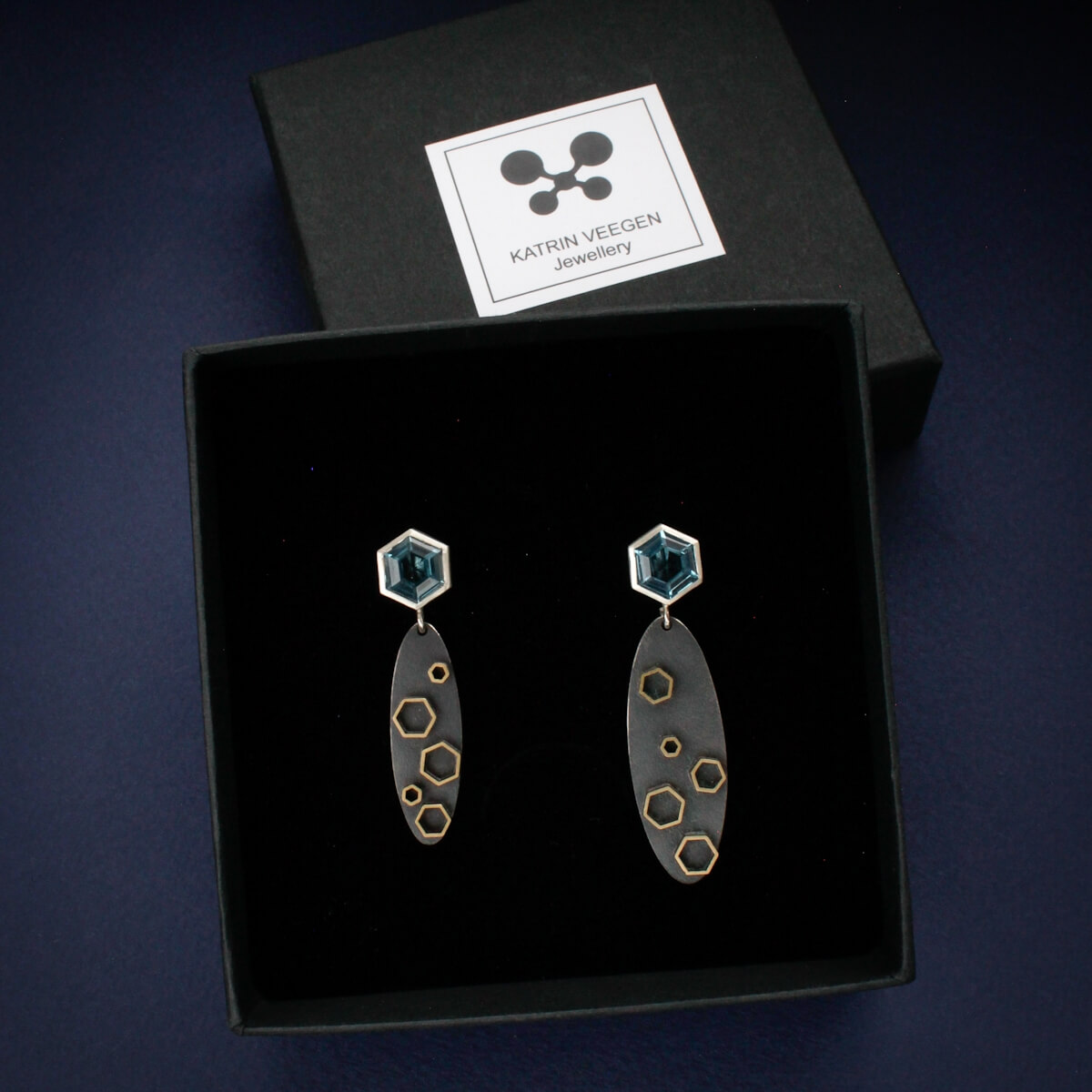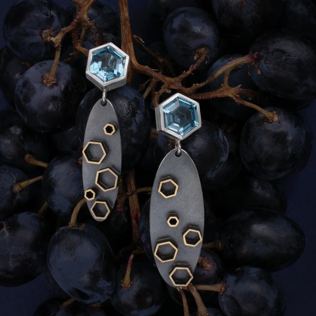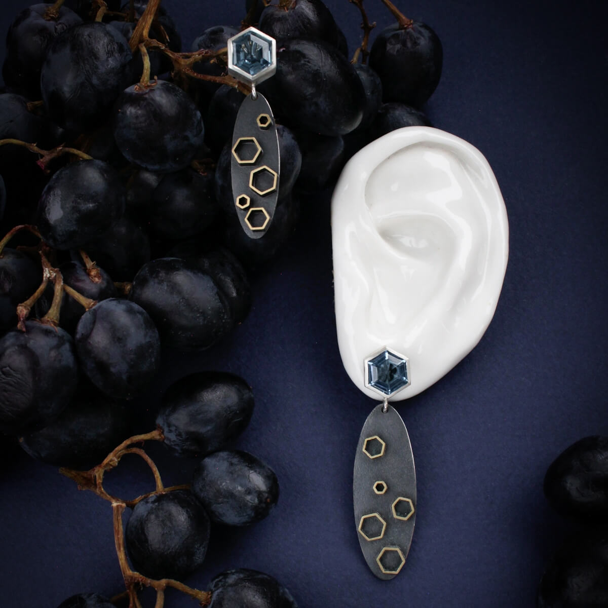 Uue seeria “Stellar” kõrvarõngad sinise kuusnurkse kiviga.