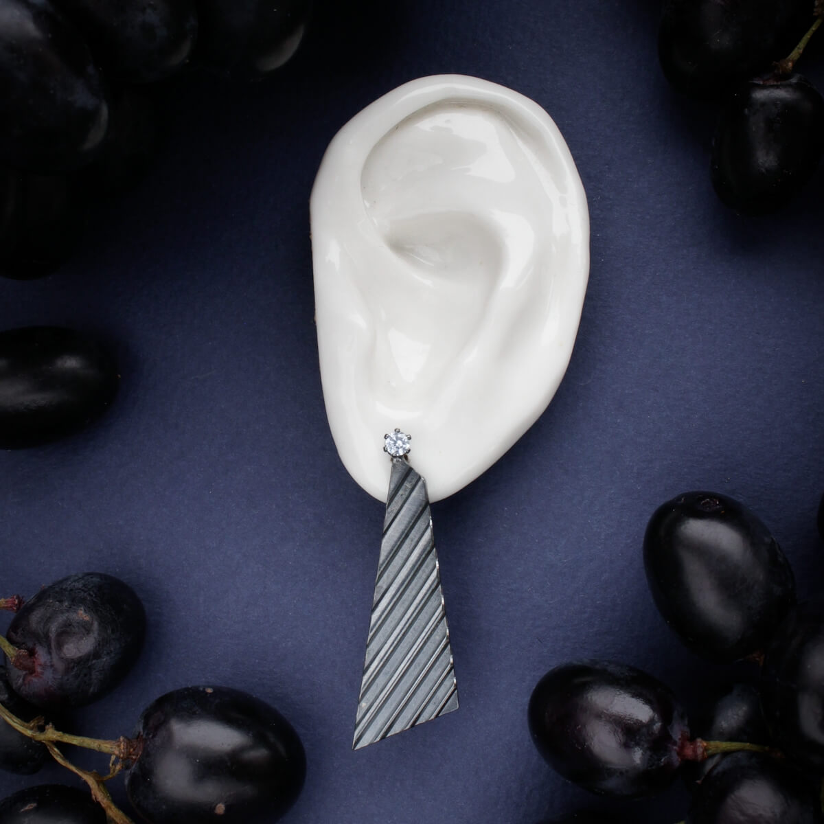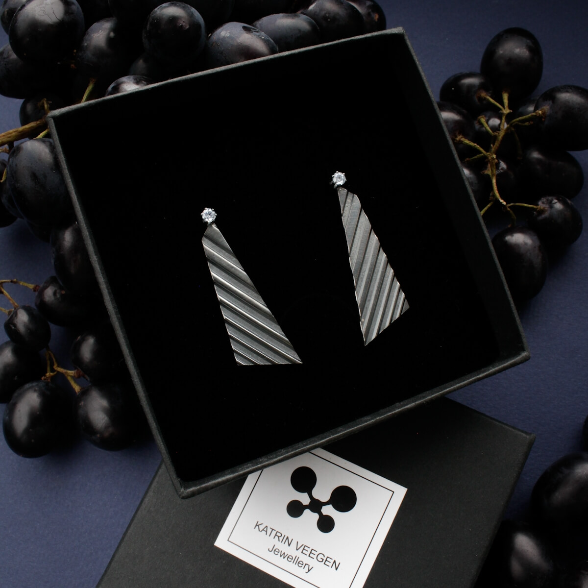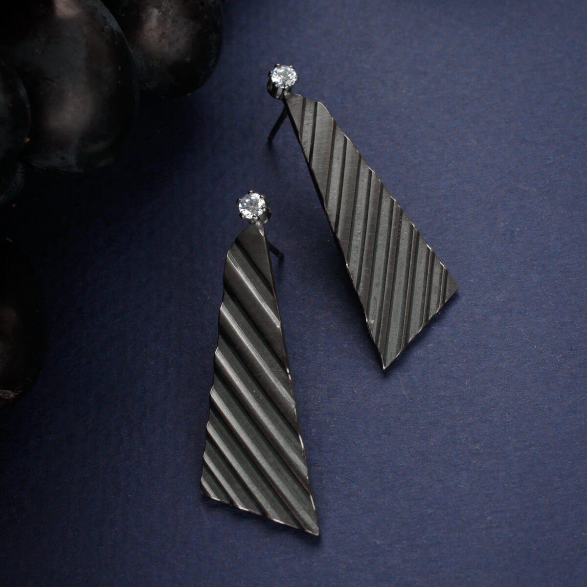 Need pikad hõbekõrvarõngad on käsitsi valmistatud 925 hõbedast ning oksüdeeritud tumedaks, et rõhutada nende graafilist ja arhitektuurset vormi. Kõrvarõngaste piklik kolmnurkne kuju ja reljeefne diagonaalsete triipude muster loovad jõulise, kuid elegantse mulje.