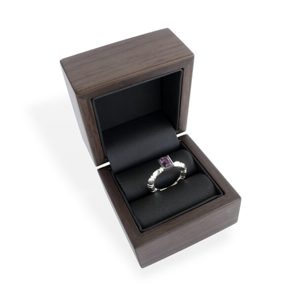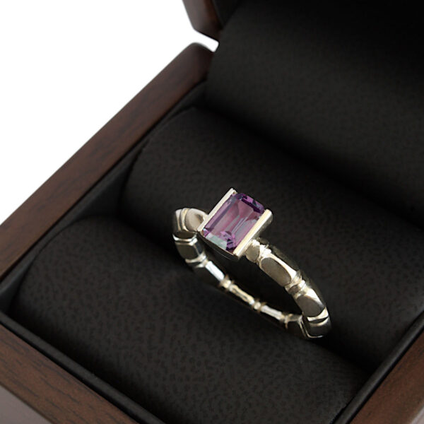 Värvimuutva kiviga elegantne hõbesõrmus. Sõrmusevõru kroonib minimalistliku kivikinnitusega Aleksandriit*. Tahklihvis ehtekivi pakub võluvat värvimängu soojast purpursest sinaka violetseni, sõltuvalt sellest, mis sorti valguse käes ta hetkel särab. Üheskoos moodustavad nad üdini naiseliku terviku nii vormilt kui ka sisult. *Kivi on laboris loodud.