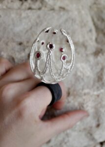 Sarjast “Emotsionaalne muna ja teised etüüdid”. Ehted said spetsiaalselt loodud samanimelise isikunäituse jaoks. Näitus toimus peale esimest suletud koroona aastat vabas ja suvises Haapsalu Kunstikooli hoovigalerii imelises paekivist hoones.